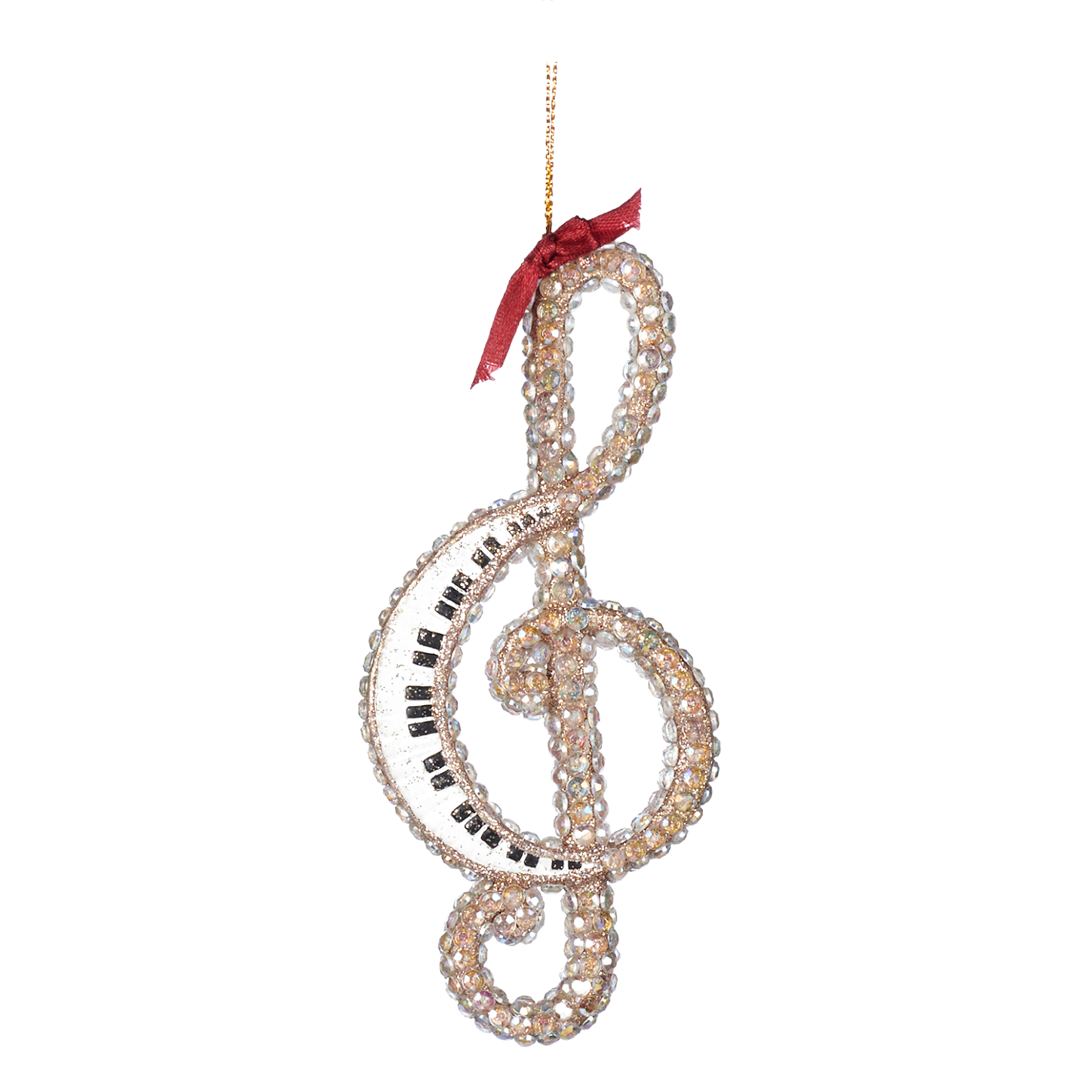 Add a touch of musical theatricality to your seasonal decor with these beautiful gem-encrusted treble clef ornaments.