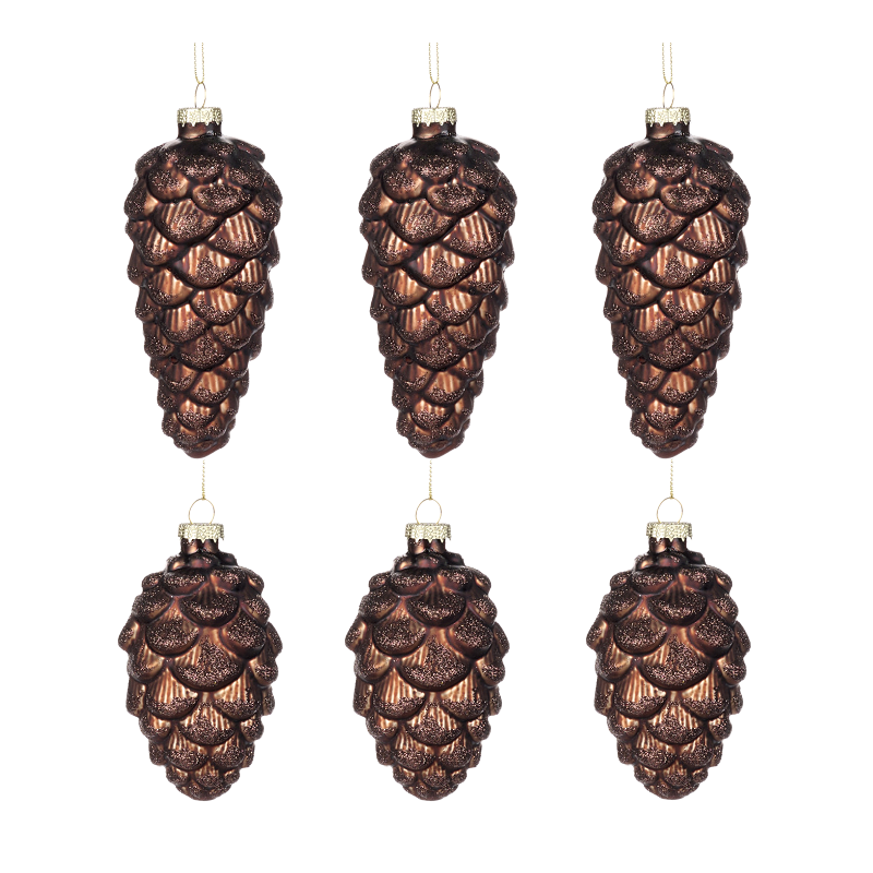 This glass pinecone set brings a warm, woodland feel to festive decorating. Their deep chocolatey brown tone and subtle glittering texture add natural richness to the tree. A wonderful accent for forest-inspired and traditional Christmas themes.