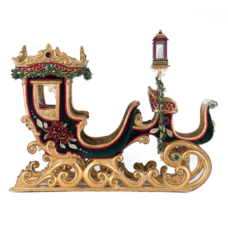 The Winter Balsam and Berry Sleigh from Katherine’s Collection is a striking centerpiece of festive grandeur. Crafted in green and berry velvet with jeweled appliqués, beaded florals, and sequined poinsettias, this sleigh embodies the opulence of the holiday season. Gold leaf runners and rich trimmings complete its regal silhouette, while every angle reveals intricate handcrafted detail.